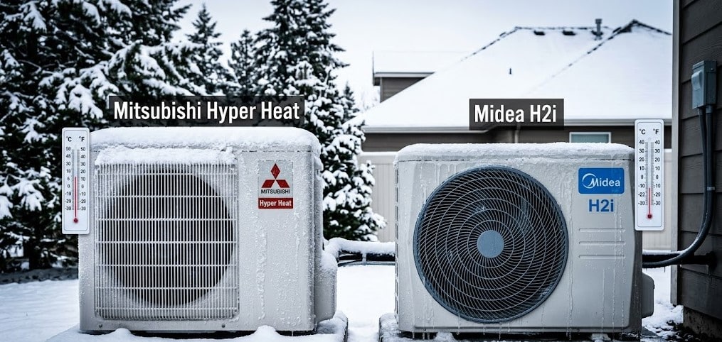 On paper, Midea’s H2i wins: rated to -22°F vs Mitsubishi Hyper Heat’s -13°F. Both numbers are real — these systems maintain heating output at those temperatures. For Oregon homeowners, neither threshold is especially relevant. The Portland metro averages fewer than 10 days below 25°F per year.