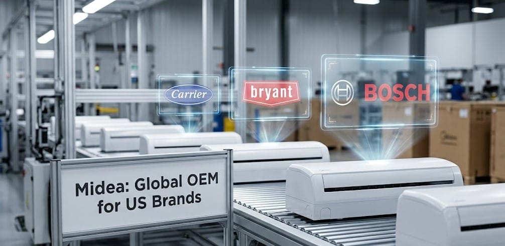 Midea is a Chinese manufacturer that became the world’s largest HVAC producer by volume. In the US market, they’re best known to consumers as Midea — but they’re better known to contractors as the OEM behind Carrier’s ductless line, Bryant’s ductless line, and Bosch heat pumps.